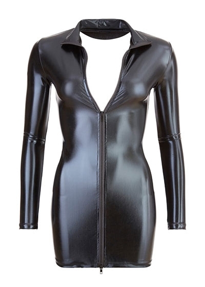 Tight-fitting, high-neck dress made out of shiny black material. With a full-length, 2-way zip at the front and long sleeves. 92% polyester, 8% spandex.