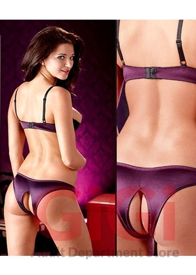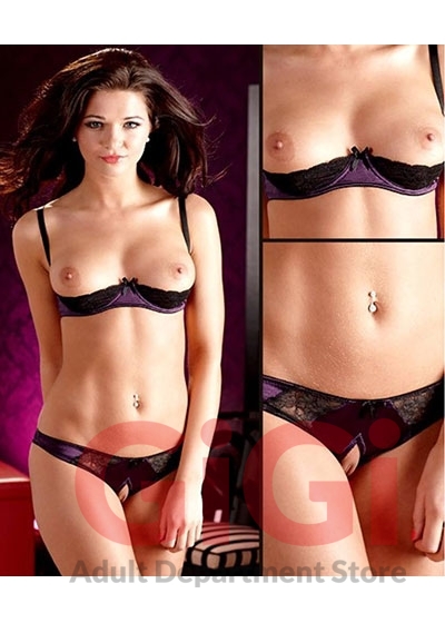 Sheer black lace with glossy purple satin fabrics is a just two good reasons to make this kinky lingerie a part of your intimate wardrobe. The 1/4 cup bra is underwired, has adjustable straps and a hook closure in the back. The panties give you full playing freedom with a front-to-back entry. 90% polyamide, 10% elastane.