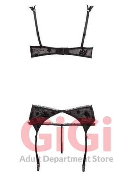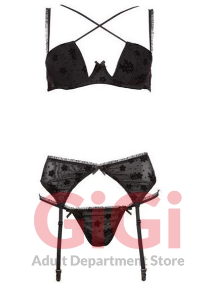 Set made of powernet, with flower-print. Push-up effect thanks to slightly padded underwired cups and integrated pads. Adjustable straps, hook-closure in the back. Suspender belt with four adjustable suspender straps. Hook-and-eye closure in the back. String included. Black. 90% polyamide, 10% elastane.