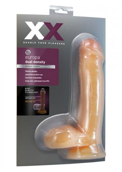 XX Double Your Pleasure. For excellence in realism choose XX. Created with dual density Sensa Feel technology, Europa replicates natural flexibility, pliability and texture. The ratio of firm inner core to soft outer layer was selected to create the most accurate representation of a perfect erection. With a lifelike form and powerful suction cup, XX is the best for yourself and your partner. Phthalates and latex free. Length 7 inches, insertable length 5.5 inches, width 1.5 inches, circumference 4.75 inches. From Blush Novelties.