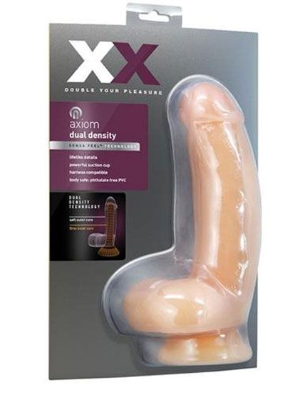 XX Double Your Pleasure. For excellence in realism choose XX. Created with dual density Sensa Feel technology, Axiom replicates natural flexibility, pliability and texture. The ratio of firm inner core to soft outer layer was selected to create the most accurate representation of a perfect erection. With a lifelike form and powerful suction cup, XX is the best for yourself and your partner. Phthalates and latex free. Length 7 inches, insertable length 5 inches, width 1.75 inches, circumference 5.25 inches. From Blush Novelties.