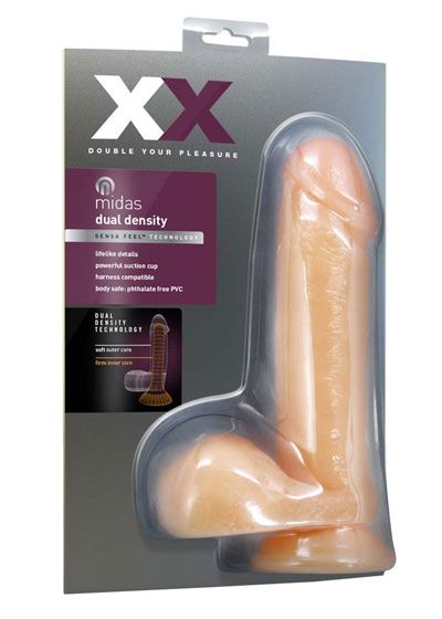 XX Double Your Pleasure. For excellence in realism choose XX. Created with dual density Sensa Feel ™ technology, Midas replicates natural flexibility, pliability and texture. The ratio of firm inner core to soft outer layer was selected to create the most accurate representation of a perfect erection. With a lifelike form and powerful suction cup, XX is the best for yourself and your partner. Phthalates and latex free. Length 7.75 inches, insertable length 6.25 inches, width 1.75 inches, circumference 5.5 inches. From Blush Novelties.