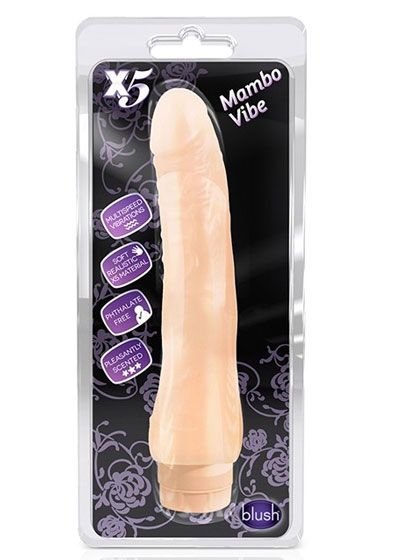 Blush Novelties X5 Series Mambo Vibe is a nine inches, multiple speed vibrator with a realistic penis shape that is slightly curved for rhythmic stimulation. Hand crafted from premium grade phthalate free Thermoplastic TPR, Mambo Vibe is ultra soft and flexible and is waterproof for dirty dancing in the shower. Mambo Vibe Moves with 2 AA batteries (not included) and is easy to clean with soap and water or a toy cleaner. Cha-cha-cha todo la noche con el Mambo Vibe. Features: slightly curved for maximum stimulation. Slim fit great for beginners. Stronger vibrations. Waterproof for play both in the water and out. Made from premium grade phthalate free materials. Soft and flexible. Multiple speed powerful vibrations. Battery operated sex toy. 5X Mambo Vibe from Blush Novelties.