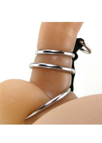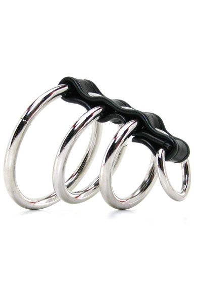 This sturdy, great looking tool boasts three strategically positioned, size-graduating steel rings joined by a soft leatherette (PVC) strap. It perfectly contains the cock in question, and is meant to be worn with the largest ring looped around the testicles, inciting all the control your heart desires. Use the lube of your choice to ease the Cage over your man, and let the night unfold as it may.