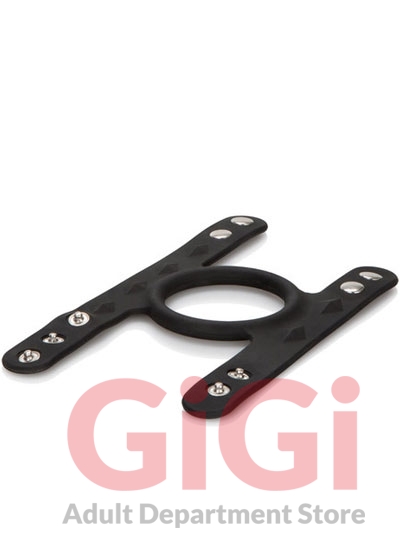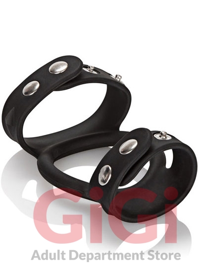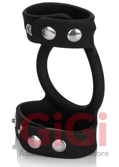 1.25”/3.25 cm (penis ring diameter) 1”/2.5 cm (scrotum rings diameter) 4” x 2.5”/10.25 cm x 6.25 cm (overall) Stretchy and comfortable Silicone erection enhancer Independent scrotum rings for added support and stamina Fully adjustable, three snap design Heavy-duty, nickel-free hardware Triple strap enhancement MATERIALS: Silicone (enhancer) Nickel-Free Iron (rivets)