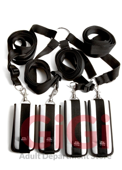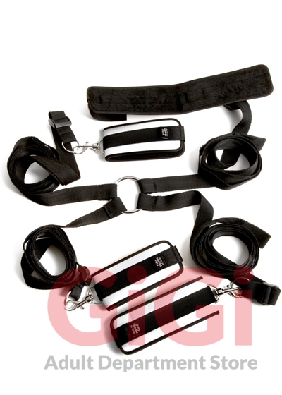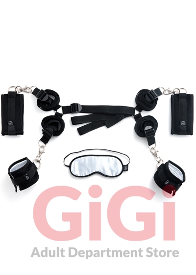 Everything you need for full body restraint, the Bed Restraint Kit expertly turns your bed into a bondage playground – whether you’re at home or on a naughty weekend away. Restraint straps fit beneath your mattress or bed frame with ease and the soft satin wrist and ankle cuffs keep you or your partner firmly in place for bedroom bondage games. Slip on the blindfold and let the play begin. Includes a satin storage bag. Black/silver. Material: blindfold: satin neoprene, faux fur and elastic, satin ties: satin, metal.