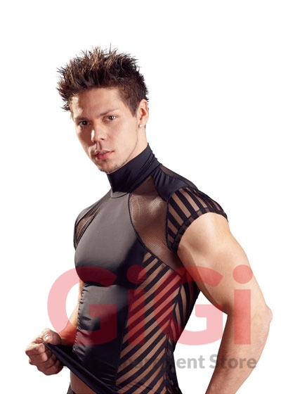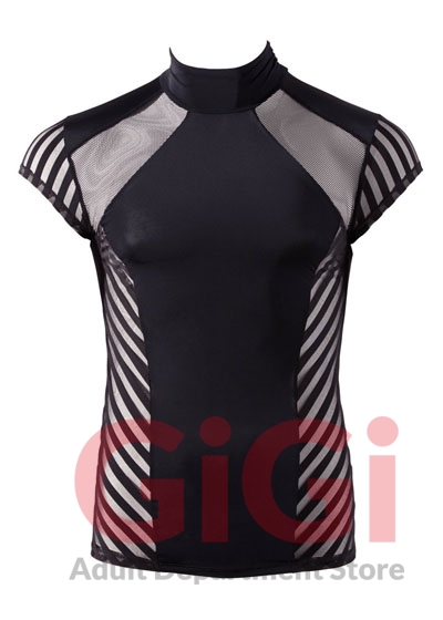 Stretchy shirt with a stand-up collar made out of two types of net in a trendy stripe design. With very short sleeves.