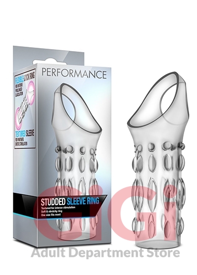 Make your rod into the ultimate sex toy with the Performance Studded Sleeve Ring! The cock sleeve with attached cock ring will surround your throbbing manhood to make it even thicker and studded, while the cock ring makes you last longer! Show your partner the ultimate time with our Performance Studded Sleeve Ring! This toy is made of TPE; fragrance free, body safe, and easy to clean! Just wash with warm soap and water, or your favorite toy cleaner, before and after every use. Pat dry with a soft towel before storing.