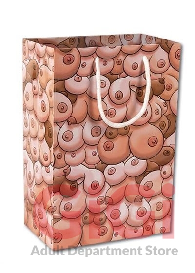 Medium size gift bag with adult theme. Risque cartoon boobs. For adult only. Reusable. Re-gift responsibly. Paper bag with glossy finish. Gift bag measures approximately 4 inches deep by 8 inches wide and 10 inches long. 2 nylon handles. Gift bag is a part of the themed party supplies from Ozze Creations.
