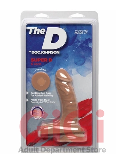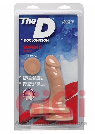 The D by Doc Johnson Super D 6 inches Vanilla Beige Dildo. Everybody wants it! The dual density 6 inches Super D, featuring a soft, pliable exterior and hard inner core, warms to the touch to create the most realistic feel imaginable. The sculpted veins and contoured head add to the realistic effect while firm balls and a sturdy suction cup base make the Super D safe for all types of play. Like the entire line of products in The D collection, the Super D 6 Inches is proudly made in America. The D by Doc Johnson is an exciting collection of our best-selling shapes, re-imagined in lifelike dual density Ultraskyn. Doc Johnson is committed to keeping the quality high and the prices affordable, so everybody can get The D. Specifications: UPC Code 782421058616. Total length 6.5 inches. Insertable, usable length 5.5 inches. Width, diameter 1.5 inches. Circumference 5 inches. Suction cup base. Materials Thermoplastic Elastomers TPE. Made in the USA.
