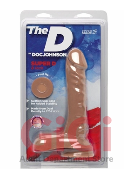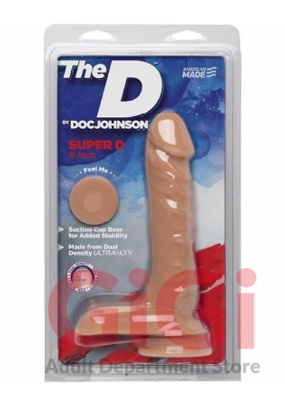 The D by Doc Johnson Super D 8 inches Dildo. Everybody wants it! The dual density 8 inches Super D, featuring a soft, pliable exterior and hard inner core, warms to the touch to create the most realistic feel imaginable. The sculpted veins and contoured head add to the realistic effect while firm balls and a sturdy suction cup base make the Super D safe for all types of play. Like the entire line of products in The D collection, the Super D 8 Inches is proudly made in America. The D by Doc Johnson is an exciting collection of our best-selling shapes, re-imagined in lifelike dual density Ultraskyn. Doc Johnson is committed to keeping the quality high and the prices affordable, so everybody can get The D. Specifications: UPC Code 782421058654. Total length 8 inches. Insertable, usable length 7 inches. Width, diameter 2 inches. Circumference 5.5 inches. Suction cup base. Materials Thermoplastic Elastomers TPE. Made in the USA