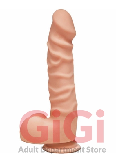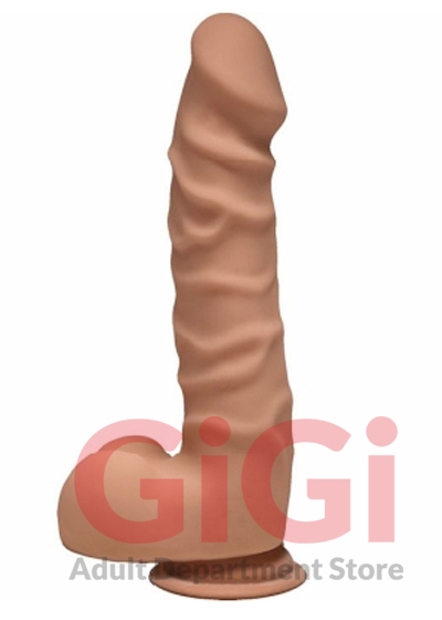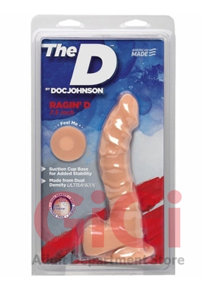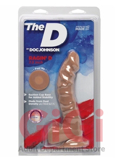 The D by Doc Johnson Raging D 7.5 inches realistic dildo. Everybody wants it! The Raging D is seven and a half full inches of lifelike dual density Ultraskyn hand crafted to satisfy with a soft, pliable exterior and firm inner core. The realistic contoured head, heavily textured veins, and plush balls look as good as they feel hitting all your hot spots, while a sturdy suction cup base holds it steady for your roughest rides. The D by Doc Johnson is an exciting collection of best selling shapes, re imagined in lifelike dual density Ultraskyn. They have committed to keeping the quality high and the prices affordable, so everybody can get The D. UPC Code 782421058777. Total length 7.5 inches. Insertable, usable length 6.5 inches. Width, diameter 1.5 inches. Circumference 5.5 inches. Suction cup base. Harness compatible, stretchy o-ring. Material Thermoplastic Elastomers TPE. Made in the USA.
