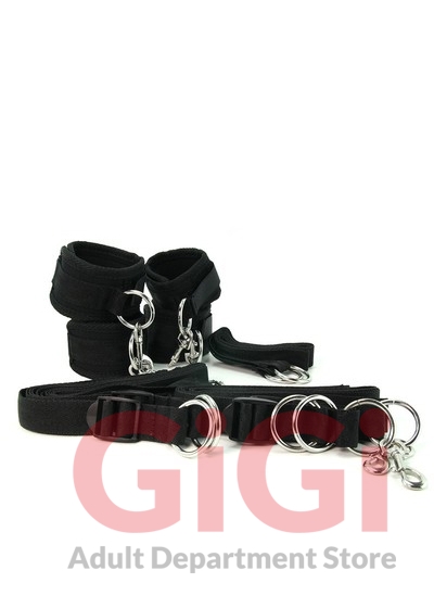 Allowing for all kinds of connectivity with cuffs, tethers and otherwise, the Spreader set contains four 5 foot (1.52m) straps and a midpoint attachment band that slip discreetly underneath (or around) bed configurations, attaching, in turn to four included neoprene cuffsvinyl bands enhanced with sturdy swivel clips and loops big O-ring fasteners.