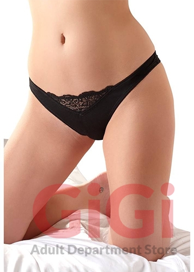 Black low-rise Brazilian G-string with a lace insert at the front. 95% polyester, 5% elastane.