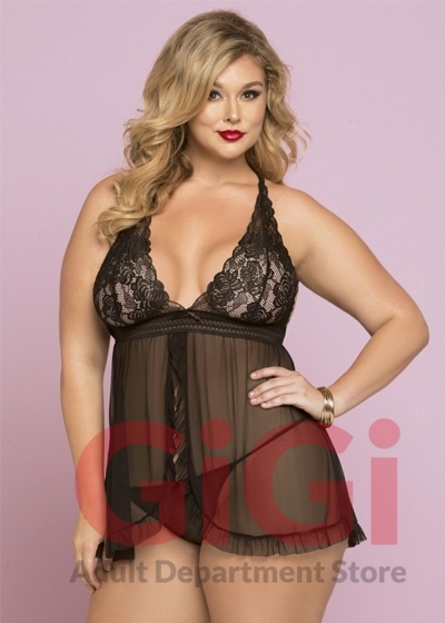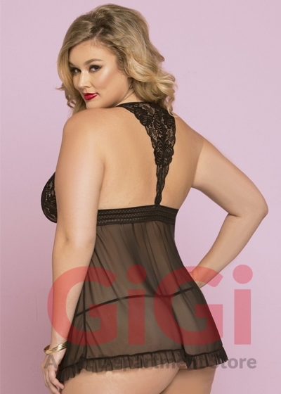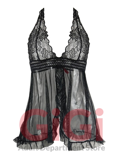 A perfect piece to tease your partner, this classic black babydoll is a must have staple! Sheer panels drape down effortlessly from the empire waist, accessorized with fishnet elastic underband. Ruffled trim of the flyaway gives a feminine touch, as does the floral lace cups that continues into the back in a racer back style. A matching thong is included! Hand wash cold, line dry. Do not bleach, iron or dry clean. 92% polyester, 8% elastane.