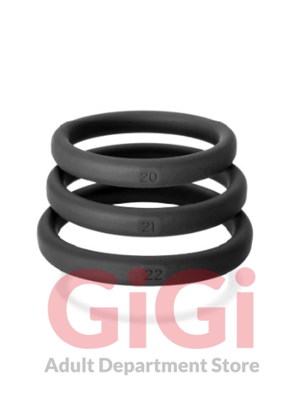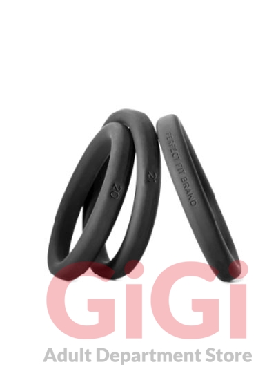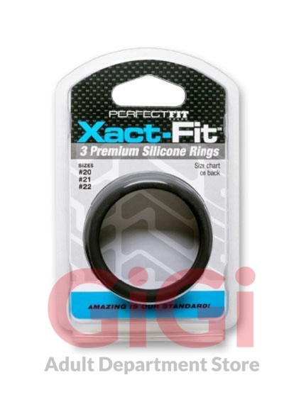 Perfect Fit Brands 3 ring kit include the following: x-large #20, #21, #22. Imagine if a finger ring only came in three sizes equivalent to the circumference of a dime and a quarter and a dollar coin, how would they fit? Well until now, cock rings were sized even farther apart than this! No wonder finding a good fitting cock ring is near impossible. Perfect Fit has developed the first cock ring sizing system designed to fit you without too much pull but with enough restriction to be truly effective. We had to throw away the sizing system that has become the de facto standard. We determined that we had to make rings that are only 0.1 inch (2.5mm) apart in sizing to get rings that would fit perfectly. The new rings are call Xact-Fit. Now we make 14 Xact Fit rings sizes where other manufacturers make only 3 to 5 sizes in this same range. We made them not too stretchy, so the rings are effective, but easier to get on and off than a metal ring. We know you will be surprised at how this sizing makes all the difference. Made of a plush soft touch silicone the Xact Fit ring is premium quality and incredibly strong. Each Xact Fit ring is stamped with its size so no more guessing! Stack the rings for additional fun. If you have favorite sizes you can order the perfect Xact Fit size individually in the future. Ring Number 20 2 inches in diameter, 6.3 inches circumference. Ring Number 21: 2.1 inches diameter, 6.6 circumference. Ring Number 22: 2.2 inches in diameter, 6.9 inches circumference.