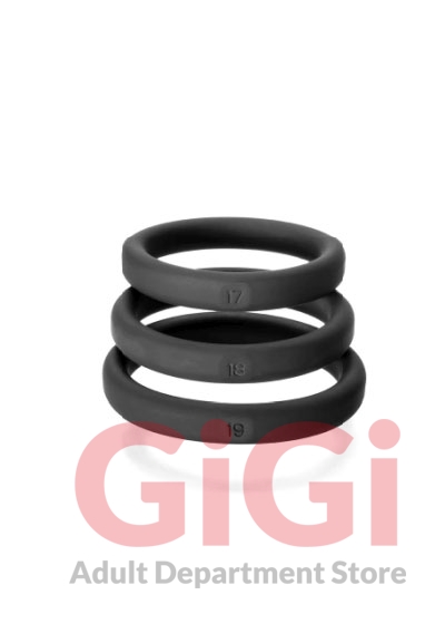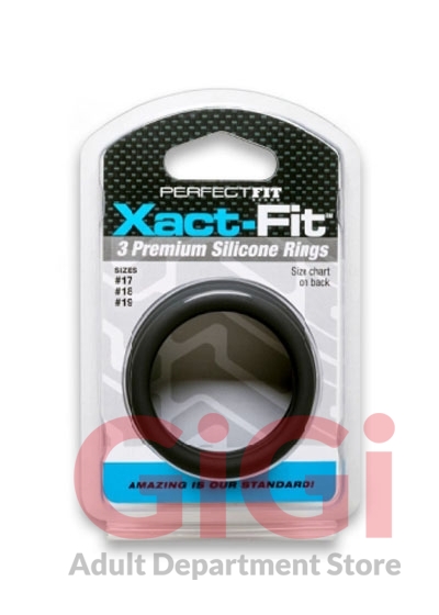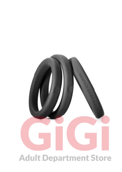 Perfect Fit Brands 3 ring kit include the following: large #17, #18, #19. Imagine if a finger ring only came in three sizes equivalent to the circumference of a dime and a quarter and a dollar coin, how would they fit? Well until now, cock rings were sized even farther apart than this! No wonder finding a good fitting cock ring is near impossible. Perfect Fit has developed the first cock ring sizing system designed to fit you without too much pull but with enough restriction to be truly effective. We had to throw away the sizing system that has become the de facto standard. We determined that we had to make rings that are only 0.1 inch (2.5mm) apart in sizing to get rings that would fit perfectly. The new rings are call Xact Fit. Now we make 14 Xact Fit rings sizes where other manufacturers make only 3 to 5 sizes in this same range. We made them not too stretchy, so the rings are effective, but easier to get on and off than a metal ring. We know you will be surprised at how this sizing makes all the difference. Made of a plush soft touch silicone the Xact Fit ring is premium quality and incredibly strong. Each Xact Fit ring is stamped with its size so no more guessing! Stack the rings for additional fun. If you have favorite sizes you can order the perfect Xact Fit size individually in the future. Ring Number 17 1.7 inches in diameter, 5.3 inches circumference. Ring Number 18: 1.8 inches diameter, 5.7 circumference. Ring Number 19: 1.9 inches in diameter, 6 inches circumference.