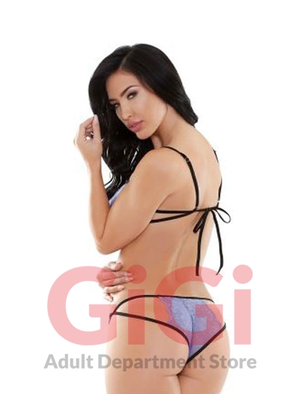 Luscious black and lavender cutout floral stretch lace panty set. This steamy panty set reveals all the right curves. Cutout features on side of bust and along front and backside with cage look.
