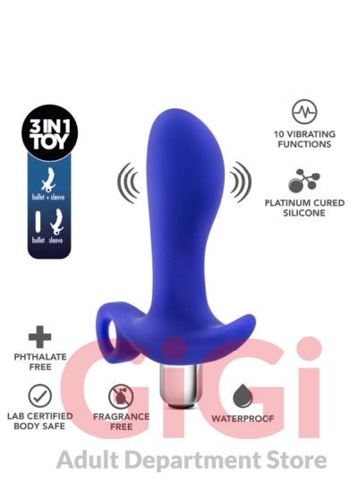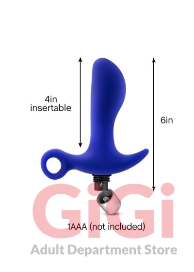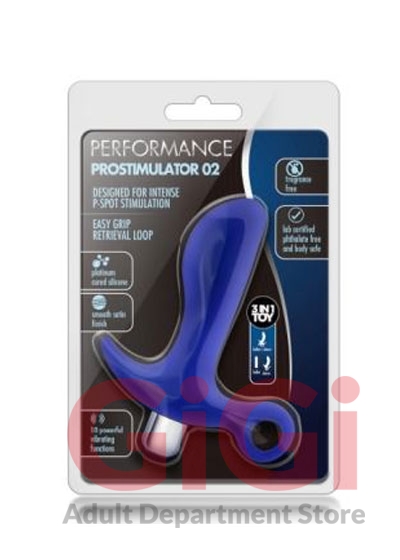 Performance Prostimulator 02 Indigo Blue from Blush Novelties. Take P-Spot stimulation to the next level with the Performance Prostimulator. The Prostimulator is a real pro at stimulating your P-Spot, designed with a special shape to target the prostate. The enclosed vibrator makes this a 3 in 1 toy: use Prostimulator or bullet alone or use them together for maximum pleasure. With 10 vibration settings to choose from youre sure to find your perfect match. The powerful whisper quiet motor provides vibrations directly to the p-spot to ensure the most powerful orgasm you will experience! This toy is made of PVC; making it nonporous, fragrance free, body safe, and easy to clean! Waterproof. Just wash with warm soap and water, or your favorite toy cleaner, before and after every use. Pat dry with a soft towel before storing. Features of P-Spot stimulator shaped for maximum Prostate stimulation. Power. 10 Vibrating Functions Powerful whisper quiet waterproof bullet vibrator enclosed. Multiple function vibrations. Bullet vibrator has 5 vibration speeds and 5 patterns.Waterproof. For play in the shower and easy cleaning. Body safe. Made of pure premium platinum cured silicone. It meets or exceeds CE and ROHS international safety standards. Phthalate, fragrance and latex free. 6 inches long, 4 inches insertion length by 1.2 inches wide.