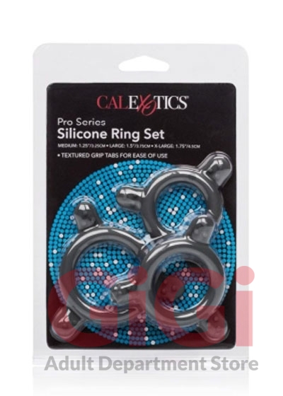 Pro Series Silicone Ring Set. Get the support you need for the ultimate thrilling orgasm. This ring is designed to get you hard and keep you there! As simple to dissemble as it is easy to use, you will find cleaning a snap. Every collection needs a good ring set. Created with ultra durable, super stretchy silicone, and designed with textured easy grip tabs for easy on and off action, this Pro Series set is the perfect fit. Three sizes to choose from make it perfect for any use you desire. Use one at a time, or use them all at once. The possibilities are endless. Slide in to support that lasts. The extra thick rings are sturdy enough for the most avid users. The superior quality silicone is stretchy enough for ultimate comfort, yet durable enough to last. This trifecta of performance will elevate your stature and extend your pleasure. When you are ready to use or remove, just grab a hold of the easy grip tabs and easily slide where you need it. Stamina never felt so good. Enhance your assets with this multi-pack, and perform like a pro.