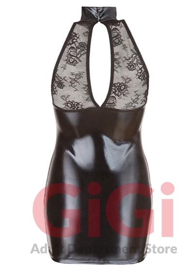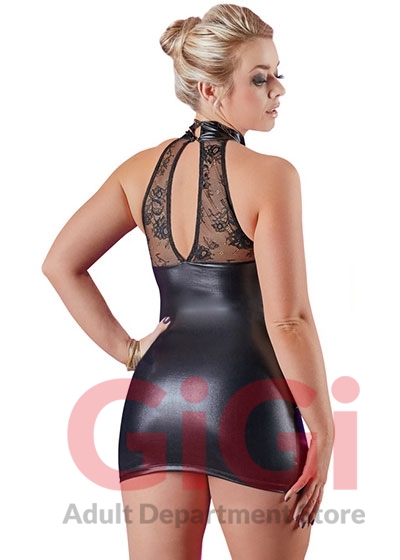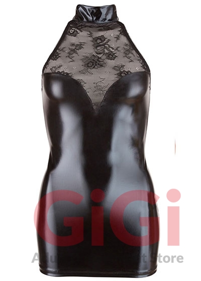 This black dress with a stand-up collar is made out of a beautiful mix of shiny wet look and delicate lace. The delicate lace inserts are in the cleavage area and at the back. This sexy tight-fitting dress also clings to your curves giving you a breathtaking silhouette! There are 2 press studs at the back of the stand-up collar. Wet look 92% polyester, 8% spandex; lace 90% polyamide, 10% spandex.