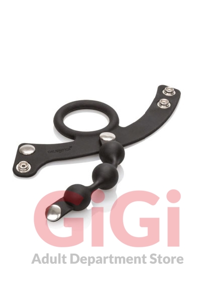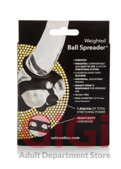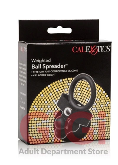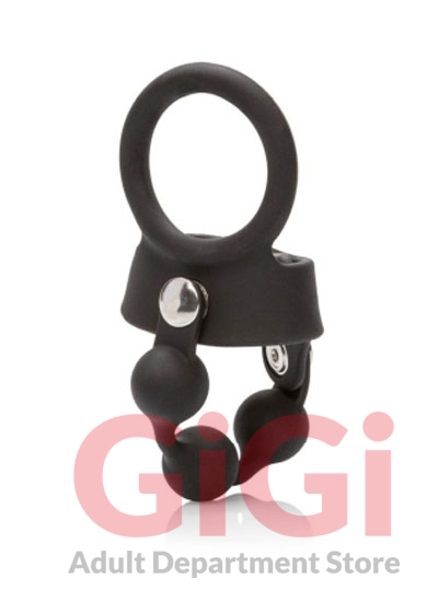 Tri Snap Weighted Ball Spreader Black. Get the support you need for the ultimate thrilling orgasm. This ring is designed to get you hard and keep you there! Enjoy the ultimate in gratification, weighted for your sensual pleasure. Non-tarnishing and nickel free, this product is safe and worry free. Harness the full potential of your manhood while experiencing extreme, customized pleasure. The Weighted Ball Spreader is designed with smooth and seamless silicone for comfortable constriction that will leave you begging for more. Combined with the durable erection enhancer, plus removable weighted ball separator, this system offers full support and stimulation for stamina and performance. Three snaps inlaid in ultra stretchy, powder soft silicone provide fully customized support. The three heavy duty, silicone coated weights are removable for versatile use. This ultimate scrotum stretching hardware totals 1.5 ounces of stretching power, and is designed to rest between your balls for intense sensations and an extreme release. Stretch your parts and your playtime while feeling the perfect amount of swing. The super stretchy erection ring holds at commanding attention, while the scrotum ring with weights keeps you firmly in place. If you are ready for intense pleasure and extended playtime, look no further. Comfortable, easy to use, perfectly weighted, and can be customized features make this the perfect addition to your toy box collection. Your stretching routine just elevated to a whole new level. Materials Silicone rings, iron snaps. 5.5 inches by 0.75 inch ring. 1.5 inches inner ring diameter.