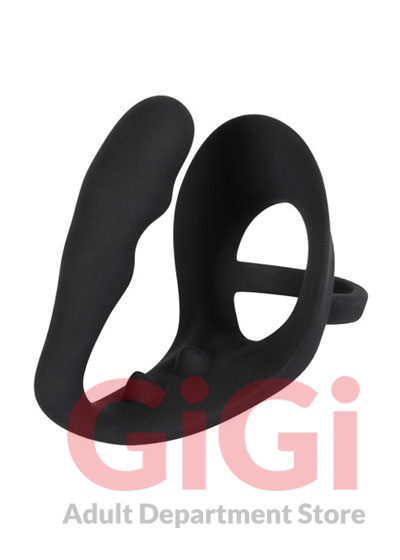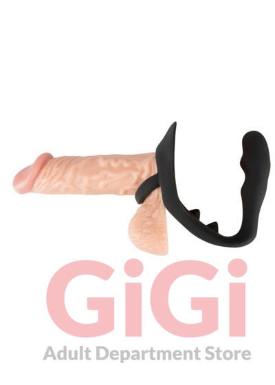 Black cock- and balls ring with anatomical formed anal plug for prostate stimulation. With nubbed perineum-part. Made of soft "Velvets" Material.