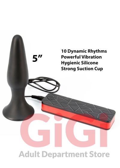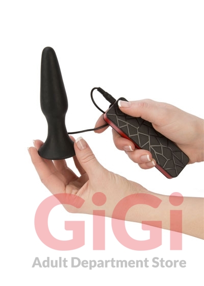 Black butt plug with vibration. The plug comes to a point but the tip is rounded off. With a suction cup. The 10 different vibration modes can be adjusted with the button on the remote control on a wire. Complete length approx. 12.5 cm, insertion depth approx. 10.5 cm. Ø 1.9-3.1 cm. Cable length 71 cm. Material: silicone, ABS, phthalate-free according to EU Regulation REACH. Please order batteries separately: 3 x Micro/AAA.