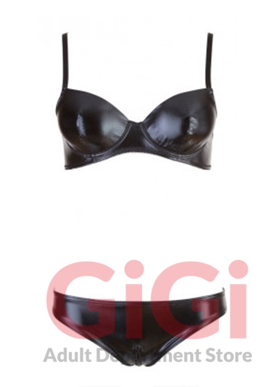 Bra set made out of black wetlook. Underwired bra with slightly padded cups, adjustable straps and a hook fastener at the back. Panties with a 2-way zip at the front. 92% polyester, 8% elastane.