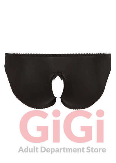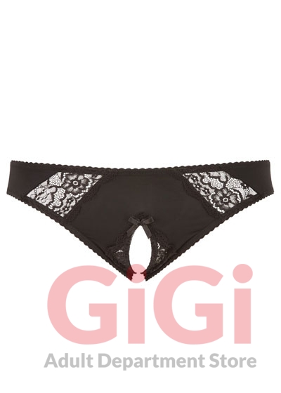 Tight-fitting briefs with stretchy lace inserts at the front. The briefs are invitingly open in the crotch area and is accentuated by a cheeky decorative bow.