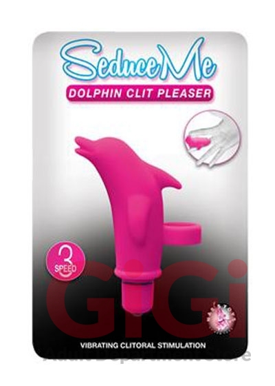 Seduce Me Dolphin Clitoris Pleaser Pink Finger Vibrator features 3 speed. Vibrating Dolphin clitoral stimulation. Waterproof vibrations. Made using body safe, phthalates free RoHs compliant material sleeve Silicone, Bullet vibrator ABS plastic. Size total length 3.5 inches. Vibrator requires 3 AG13/LR44 batteries, included.