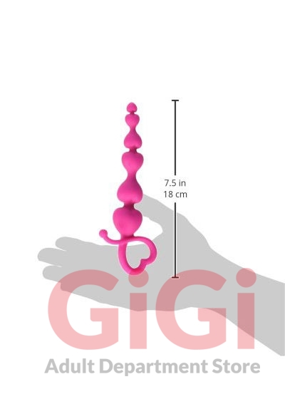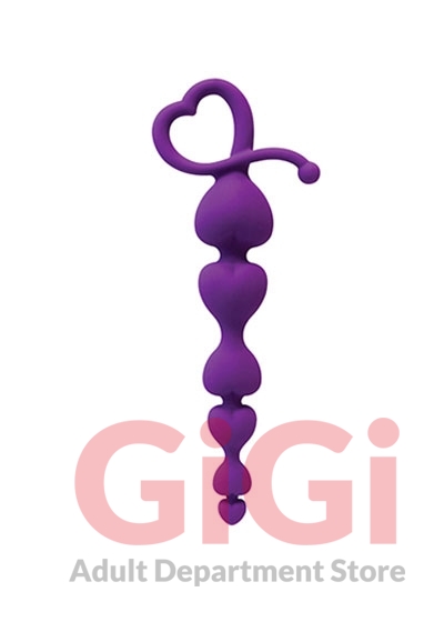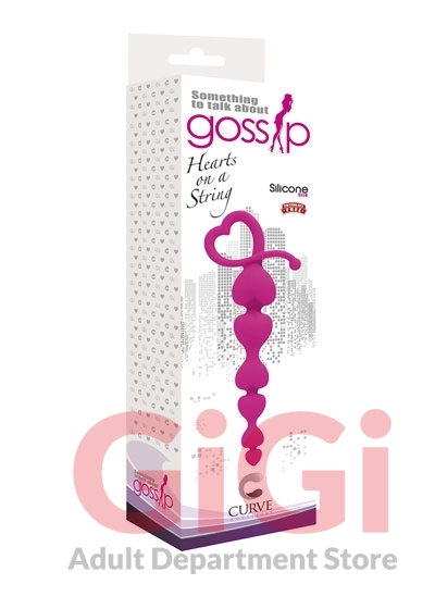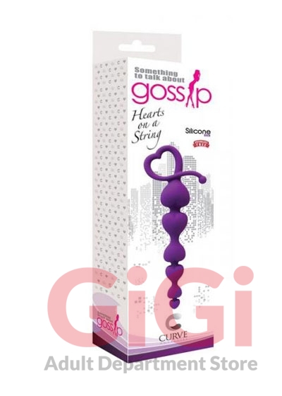 Curve Novelties Gossip something to talk about line Hearts On A String Violet Purple. Heart shaped, graduated anal beads with easy retrieval loop. Flexible yet firm for easy insertion. Can be warmed or cooled for a variety of sensations. Ultra premium Silicone Silk feels like velvet on your skin. Features: phthalate free, latex free,100% Silicone. Dimensions 7.25 inches by 1.125 inches. Weight 1.6 oz. Care clean with soap and warm water or toy cleaner. Use only with water based lubricants.