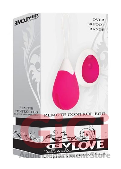 Evolved Novelties Rechargeable Egg Pink Vibrator with Remote Control. Immerse yourself in the exquisite sensations of this fully rechargeable vibrating egg! Not only does it boast ten different speeds and functions to titillate and tease, but it has got a remote control that allows for hands free fun, and couples play! You can let this toy slip inside safely with its convenient retrieval loop and make sure you take your egg into the bath or shower with you too, as it is completely waterproof and submersible! Clean up is a snap with Evolved Toy Cleaner and a warm water rinse.