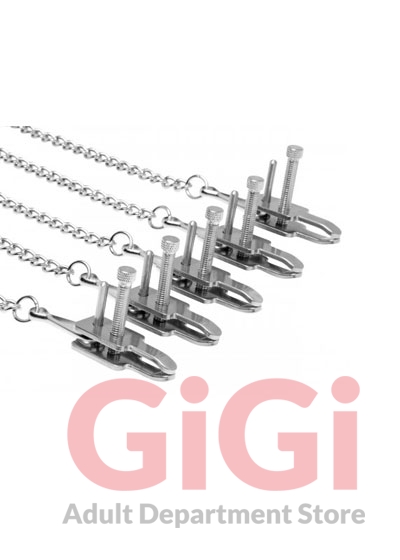 Keep your submissive under your complete control with this unique design from Master Series. The adjustable pressure of these five clamps make this a perfect system for any level of masochist. The pinching pleasure ranges from teasingly light to extreme! Just twist the thumbscrew to adjust. These clamps can be attached anywhere on the body you desire, so use your imagination to rearrange the 7 pieces of chain, 6 connecting clips, and 5 clamps to whatever configuration you desire. You can even connect a leash or weights!