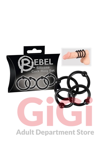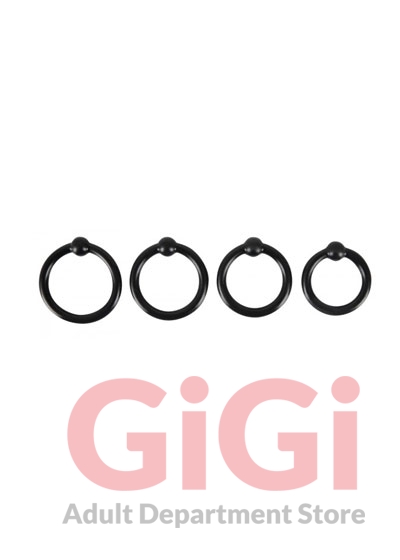 Set of 4 cock rings. Each ring has an integrated bead (Ø 1 cm). Black. Ø of ring: 25, 28, 30 and 32 mm (flexible). Ring thickness: 5 mm. Material: silicone, phthalate-free according to EU Regulation REACH.