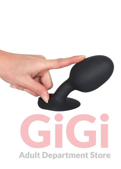 Black butt plug with a stimulating, rotating inner ball, a round tip and a suction cup. Complete length 13.5 cm, insertion depth 12 cm, Ø 2.2-5.6 cm. Material: silicone, phthalate-free according to EU Regulation REACH.