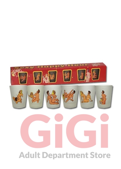 6 glasses with cartoon figures in different sex positions. Glass height app. 5.5 cm.