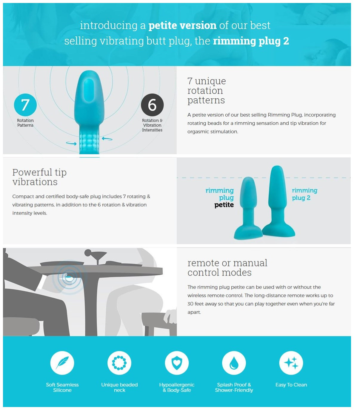 A petite version of our best selling Rimming Plug, incorporating rotating beads for a rimming sensation and tip vibration for orgasmic stimulation. This compact, body-safe,seamless, silicone plug is powerfully charged to stimulate all the right spots. Use with orwithout the wireless remote control that not only makes use a breeze, it also allows for diverse couple play possibilities.