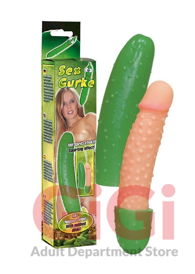 A fully dotted penis under a green cucumber sheath! It sucks up any liquid and squirts it out again when pressed. Material used: PVC