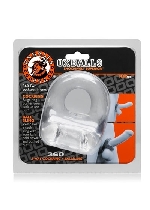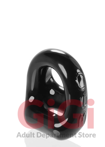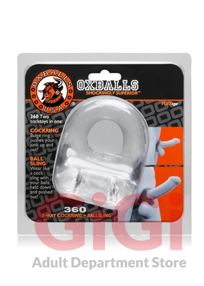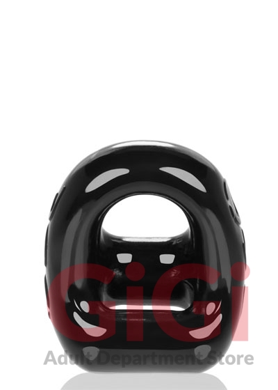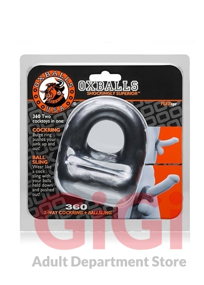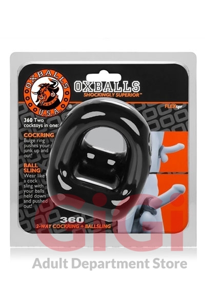360 Dual Use Cock Ring Black. Variety is the spice of life and at Oxballs, we love introducing new nasty ways to play. 360 is our new two in one cock ring and ball sling that will beef up your meat and have you blowing load after load. If you are a fan of our blubbery cock rings like hung or juicy, you are going to love 360s super soft, squishy design. The bottom has a thick rubbery base that rests under your sweaty sack to push your package up and away from your body. 360 ring is perfect for filling out a tight jockstrap or creating a mouthwatering bulge under your favorite skintight gear. Guys will be lining up to see what you are packing. If you are into ball stretching or having your nuts handled, the padded base doubles as a ballsing that is designed to push down on your sack for a sweet stretching sensation. Just lube up the opening, pop your balls through and you are ready for a serious ball banging session or some quality JO time. 360 ring is made from their signature Flex-TPR so it is lightweight and compact but still thick and fleshy. Flex-TPR safe, non-toxic and phthalate free. Lube safe water based lubricant. Stats approximate: height 3.25 inches, outside circumference 9 inches, inside circumference stretches to fit you 3.5 inches, thickness 1 inch to 1.75 inches. Weight 3.2 ounces.