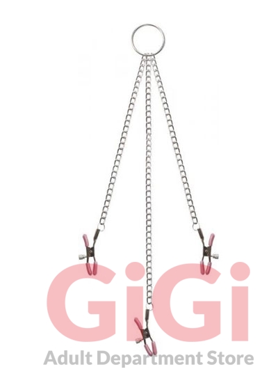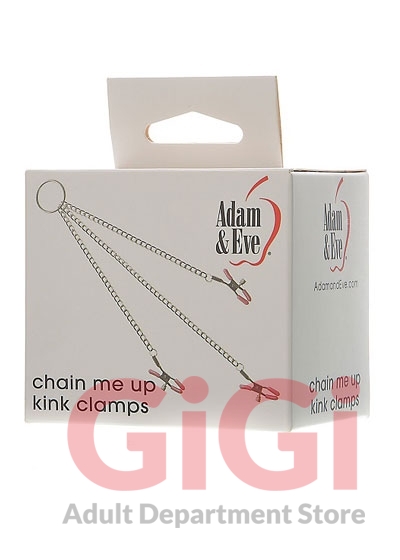 Adam and Eve Chain Me Up Kink Clamps. Take your kinky cravings to the next level with this sexy set of bondage clamps and chain. Two soft tips clamps put the squeeze on your nipple. A third clamps on to your clitoris to connect all of your erogenous zones. Try dancing, swaying and tugging to amplify your erotic sensations. Each clamp is adjustable to give the perfect level of naughty pain and pleasure. Size 11 inches nipple chain, 12.75 inches clitoral chain. Bulk weight 2.4 ounces. Made using high polished metal chains, Thermoplastic Rubber TPR ends. Five year warranty from Adam and Eve Toys.
