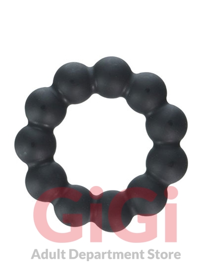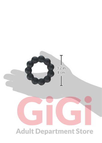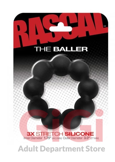 The Baller from Rascal. 100% silicone, 3X stretch, no roll strong design. Features stimulation balls for more powerful erections. Can be worn three ways: around the shaft, around the balls, or around both the shaft and balls. Size inner diameter 1.75 inches, outer diameter 3 inches. Black.