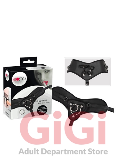Adjustable faux leather strap-on harness with 2 rings (Ø 4 and 5.4 cm) for either a dildo or vibrator that has a suction cup (not included). The press studs mean that the rings can be swapped. There is cheeky lacing at the back that gives the harness a corset look. Black. Hip circumference: max. 140 cm. Polyurethane, steel, phthalate-free according to EU Regulation REACH.