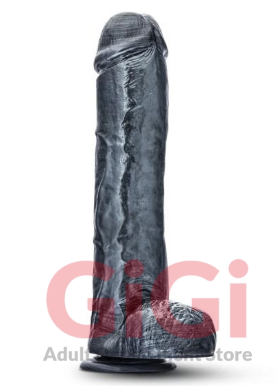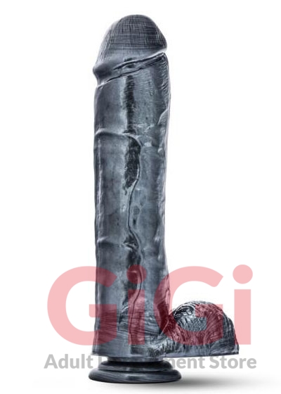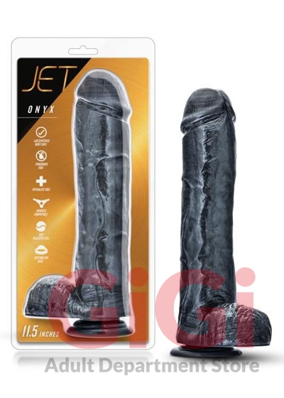 Jet Onyx Carbon Metallic Black Dildo. Finished in Carbon metallic black, The Jet Onyx is a sleek yet menacing 11 Inches realistic cock! Measuring 9 insertion inches with a girth of 2.5 inches, this is a tool for the experienced! Stick him to any smooth surface with his sturdy suction cup for a hands free challenge. Or, strap him into your harness for intense partner play. He has all the sculpted veins, balls, and texture of a real cock.