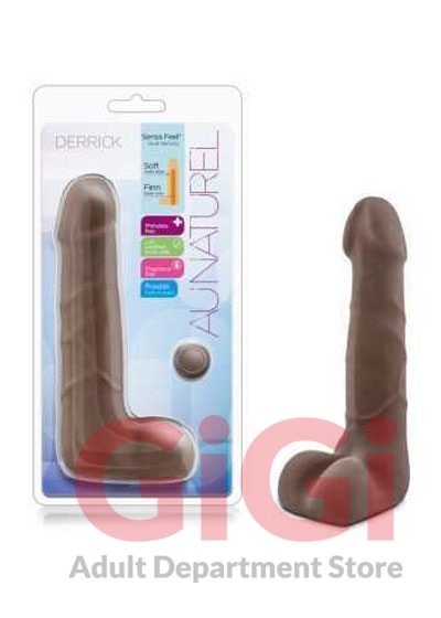 Au Naturel Derrick Chocolate Brown Dildo. Made with Blush Novelties new Sensa Feel dual density technology, Derrick is perfectly soft to the touch while its inner core is firmer to maintain rigidity, just like a hard, erect cock should feel. For those seeking a sensual lover, Derrick has plush balls and a pose able spine that can bend, twist and angle to hit all your pleasure points. Made of phthalate free, skin safe Thermoplastic Elastomers TPE, Derrick is low maintenance; use gentle soap and water then let air dry.