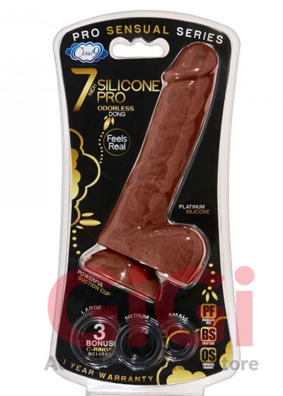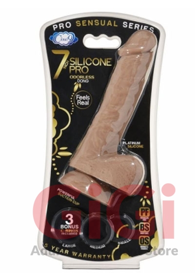 Pro Sensual Series from Cloud 9 Novelties. 7 inches Silicone Pro odorless dong feels real made using Platinum Silicone. Powerful suction cup. 3 bonus cock rings included. Phthalate free. Body safe. Personal 7 Inches Silicone Pro Odorless Dong With 3 Bonus Cock Rings. Sized and shaped perfectly, this realistic dong can quickly bring you to orgasm! Perfect for both anal and vaginal play. Made of platinum grade odorless silicone. Harness compatible the base ensures stability and the suction cup seals to most flat surfaces for hands free pleasure. This silky silicone dong is hypoallergenic, hygienic, phthalate free, odorless, boilable, bleachable and completely non-toxic. To clean boil for 2 minutes, place it in your dishwasher, or wash with soap and water. Use only with water-based lubricant. Dong specifications: weight .8 pound. Width 1.5 inches, length 7 inches insert able length 6 inches. Made of platinum grade silicone. Phthalate free platinum grade Silicone. Realistic veins throughout the shaft for added sensation. Perfect beginner size 7 inches with a realistic shape. Bonus 3 super stretchy cock rings included. Strap on compatible. Harness not included. Easy to clean and odorless Skin safe hypoallergenic