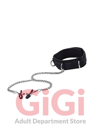 Shots Toys Ouch line Velcro Collar with Nipple Clamps Black. If you want to reach a higher level in your sex life and make it more extreme, you have to try this Velcro Collar with Nipple Clamps! With the adjustable clamps you can tease or dominate your partner totally. The material of the collar is very soft on the inside and very comfortable to wear. Because of the Velcro material you can adjust your collar to every size you prefer. Specifications materials Velcro, Neoprene, Metal. 14.57 inches chain. Adjustable tightness. Please note package contains nudity.