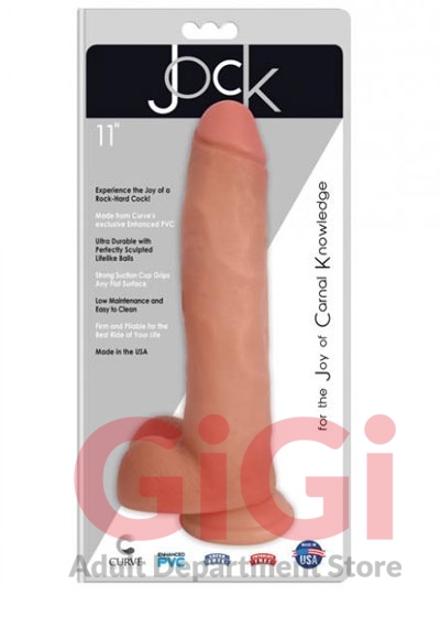 Jock 11 inches Dong with Balls is ultra durable with perfectly sculpted lifel ike balls. Strong suction cup grips any flat surface for solo play. Or with a partner and a strap on harness. Low maintenance. Easy to clean. Firm and pliable for the best ride of your life. Exclusively formulated Enhanced PVC. Made in the USA. Materials body safe PVC. Use with any water based personal lubricant or silicone based lubricant. Care clean with soap and warm water or toy cleaner before and after use. Dimensions 11 inches by 2.625 inches overall. 9.38 inches insertable.