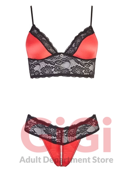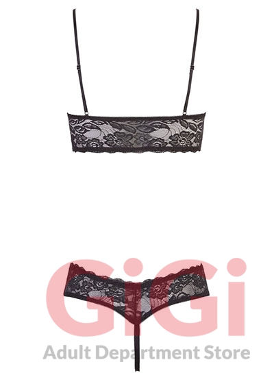 A sweet ensemble that is made up of a wireless bra and matching string. The bra has a wide strip of beautiful black lace underneath the breasts and red satin cups. The bra straps are adjustable and the small rhinestone heart between the cups is extremely eye-catching. The string is also made out of black lace and red satin, and is also invitingly open in the crotch area. 90% polyamide, 10% spandex.