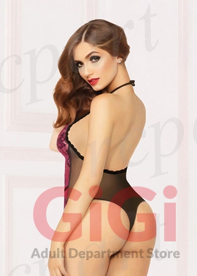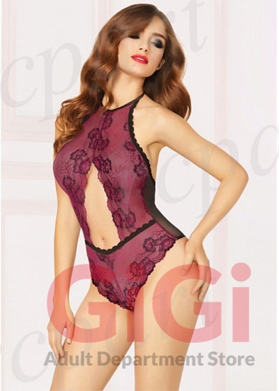 Cross-dye lace teddy with halter neck, front cut out, mesh back, lace trim, gold hardware, thong back, and snap crotch.